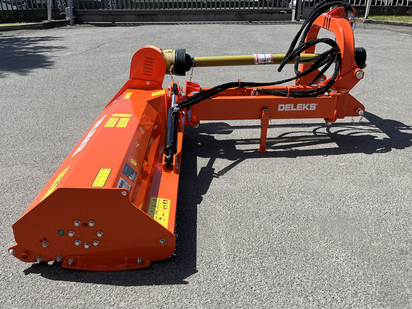 Über die Spur hinaus und in geneigter Arbeitsstellung s säubert der Deleks Böschungsmulcher Straßenränder und Gräben, bei Vertikaler Arbeitsstellung hingegen stutzt er Hecken und Böschungen. Durch das in der Mitte des Gerätes verbaute Getriebe kann der Mulcher auch mittig hinter dem Schlepper gefahren werden, damit eignet er sich auch Bestens zur Ausführung von Arbeiten in schmalen Reihenabständen.