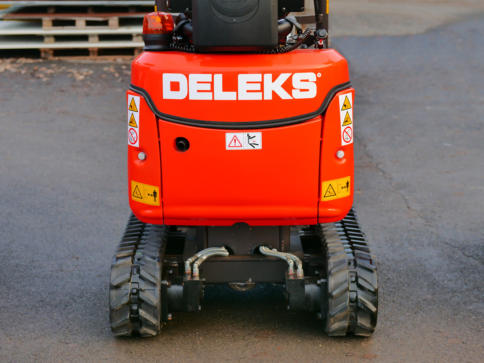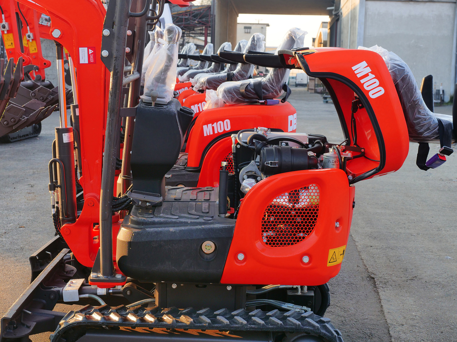 De compacte minigraafmachine DELEKS® M100 (1 ton) is uitgerust met een Kubota D722-dieselmotor met drie cilinders, een uitschuifbaar onderstel en een zwenkbare giek.