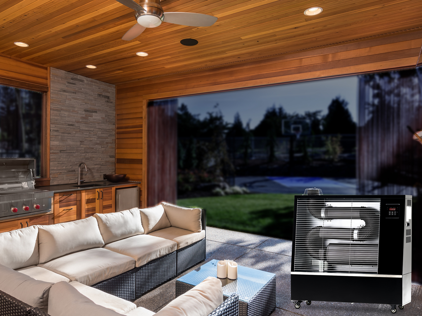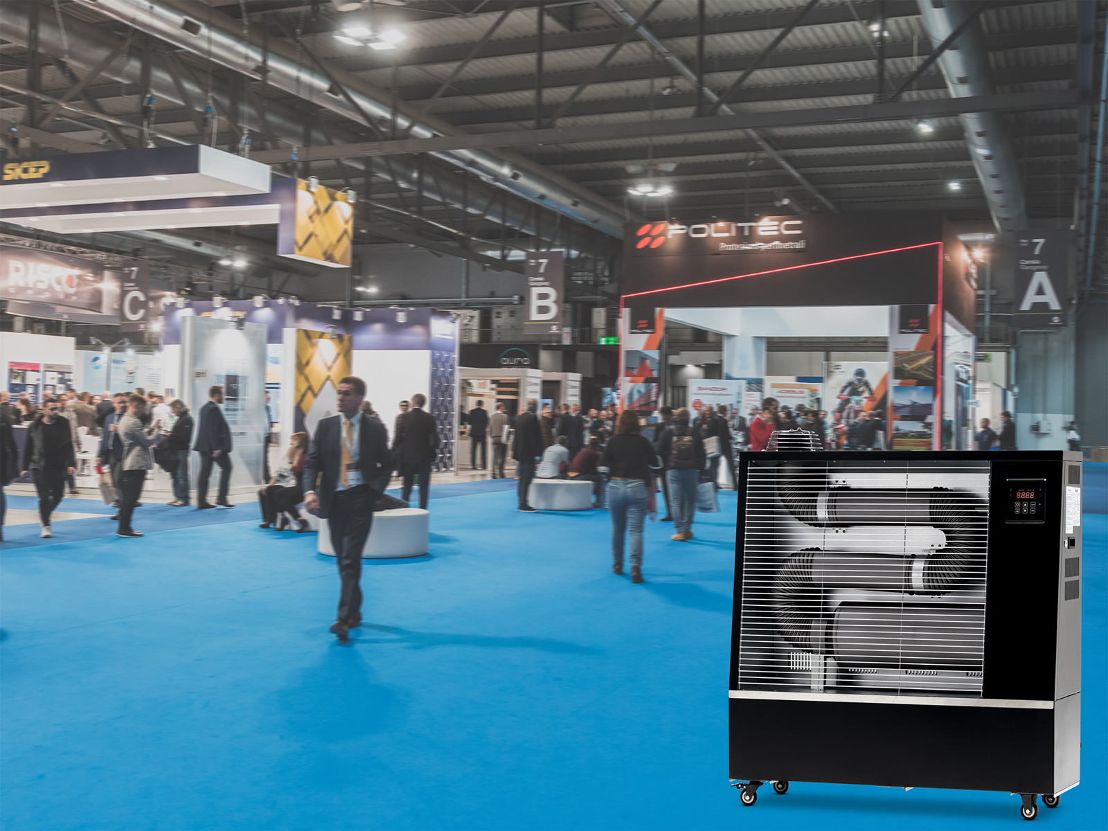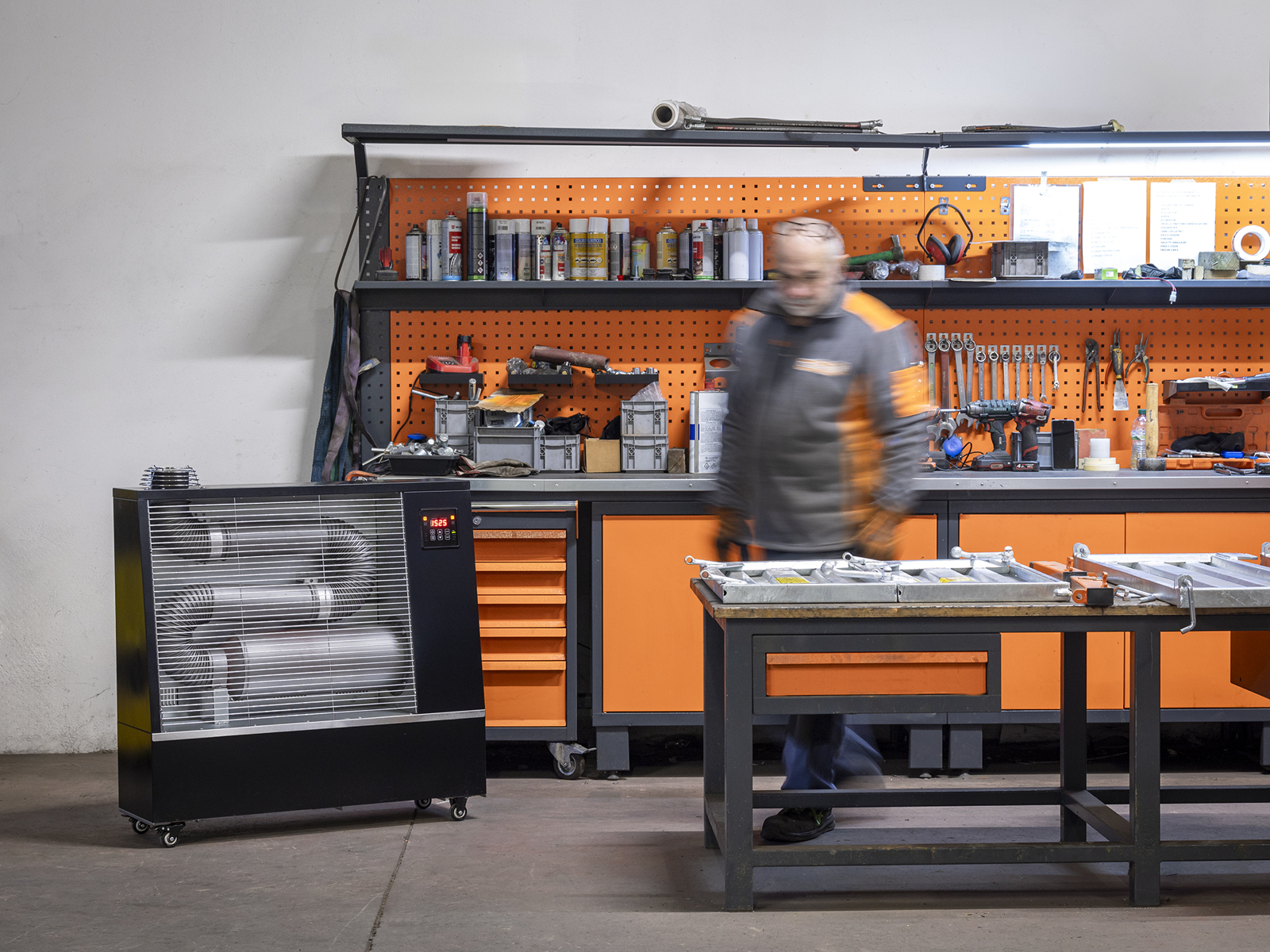 Innovative heating system for ventilated closed spaces (mechanical workshops, commercial, industrial, agricultural areas, warehouses, gyms) and outdoors such as greenhouses, terraces, construction sites...