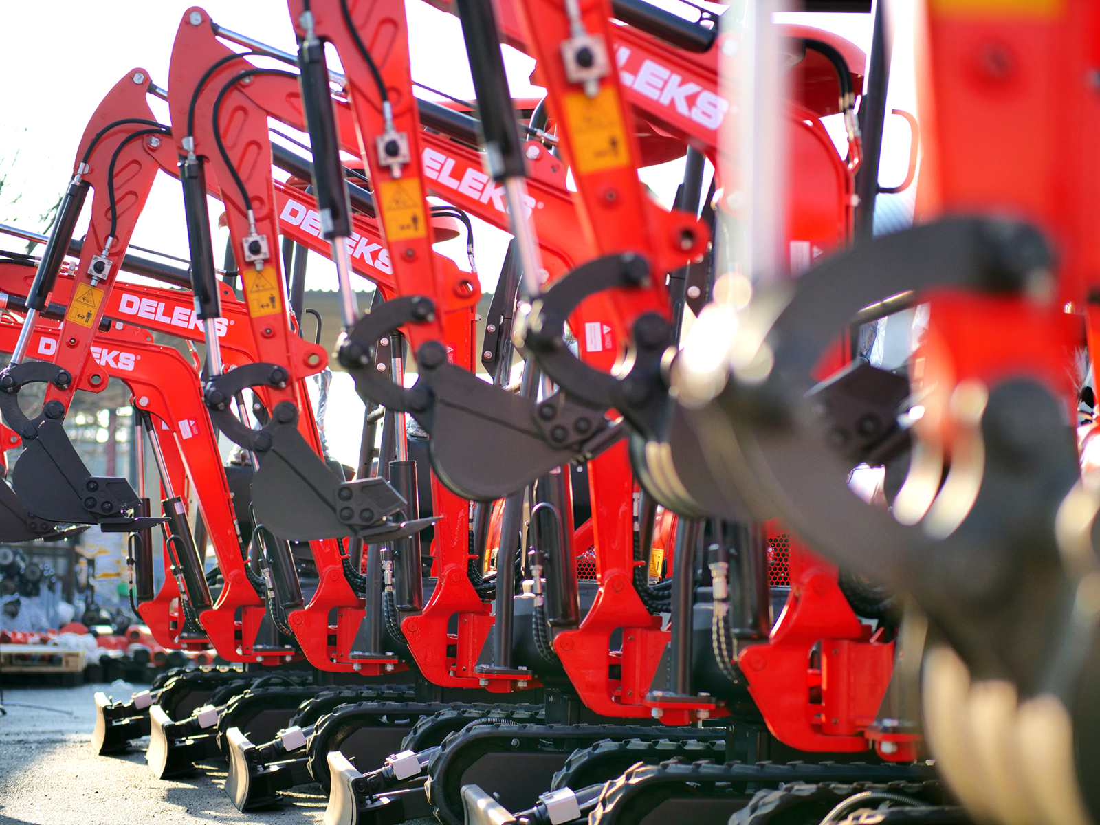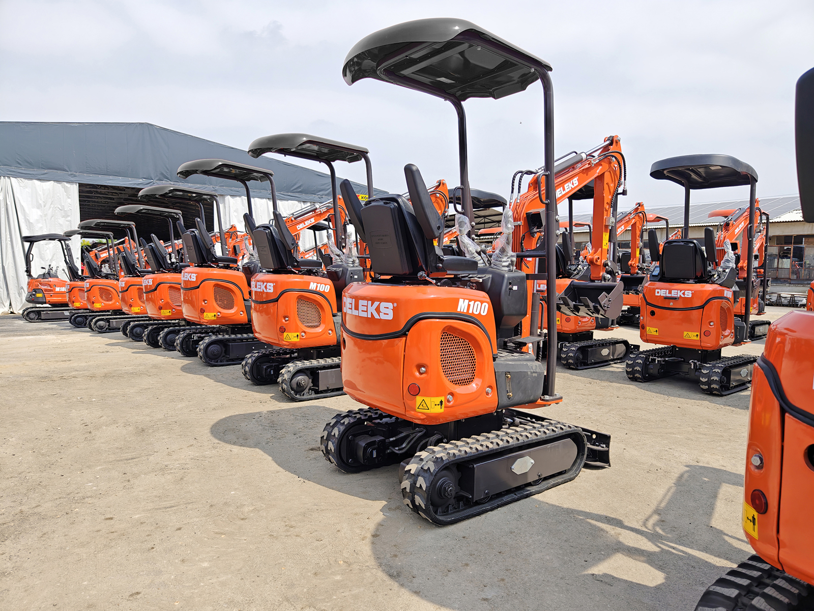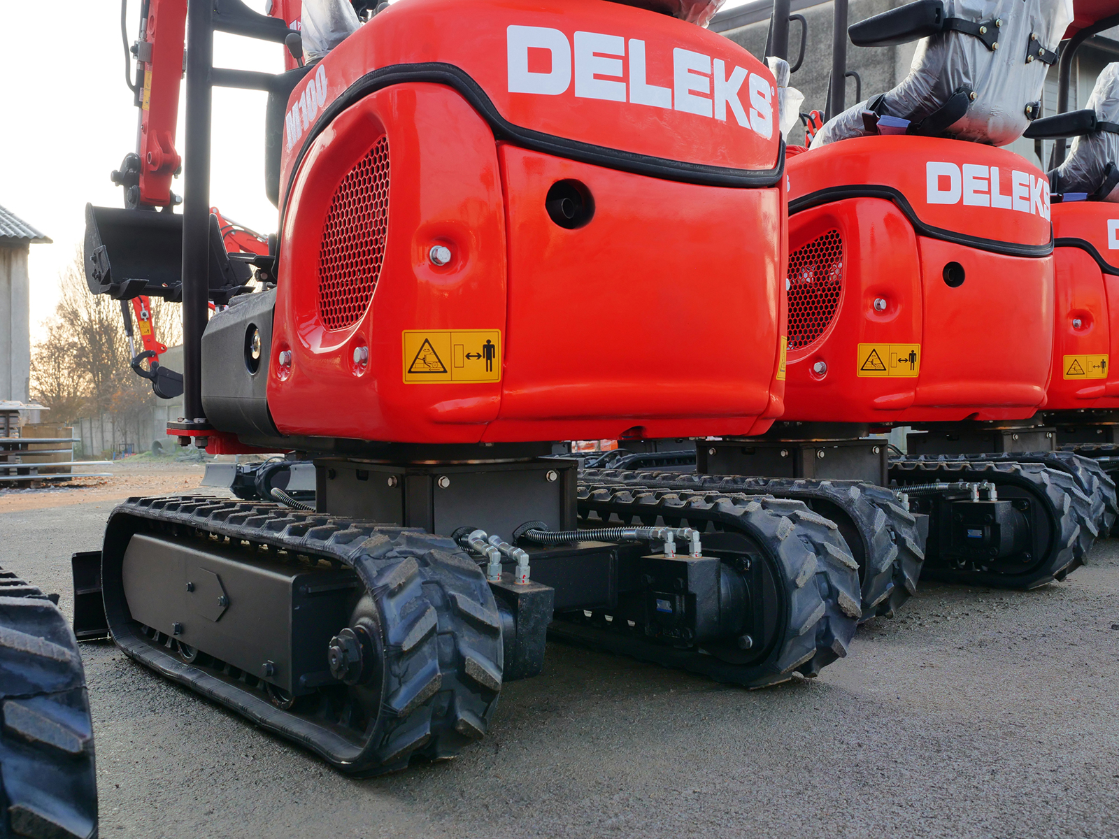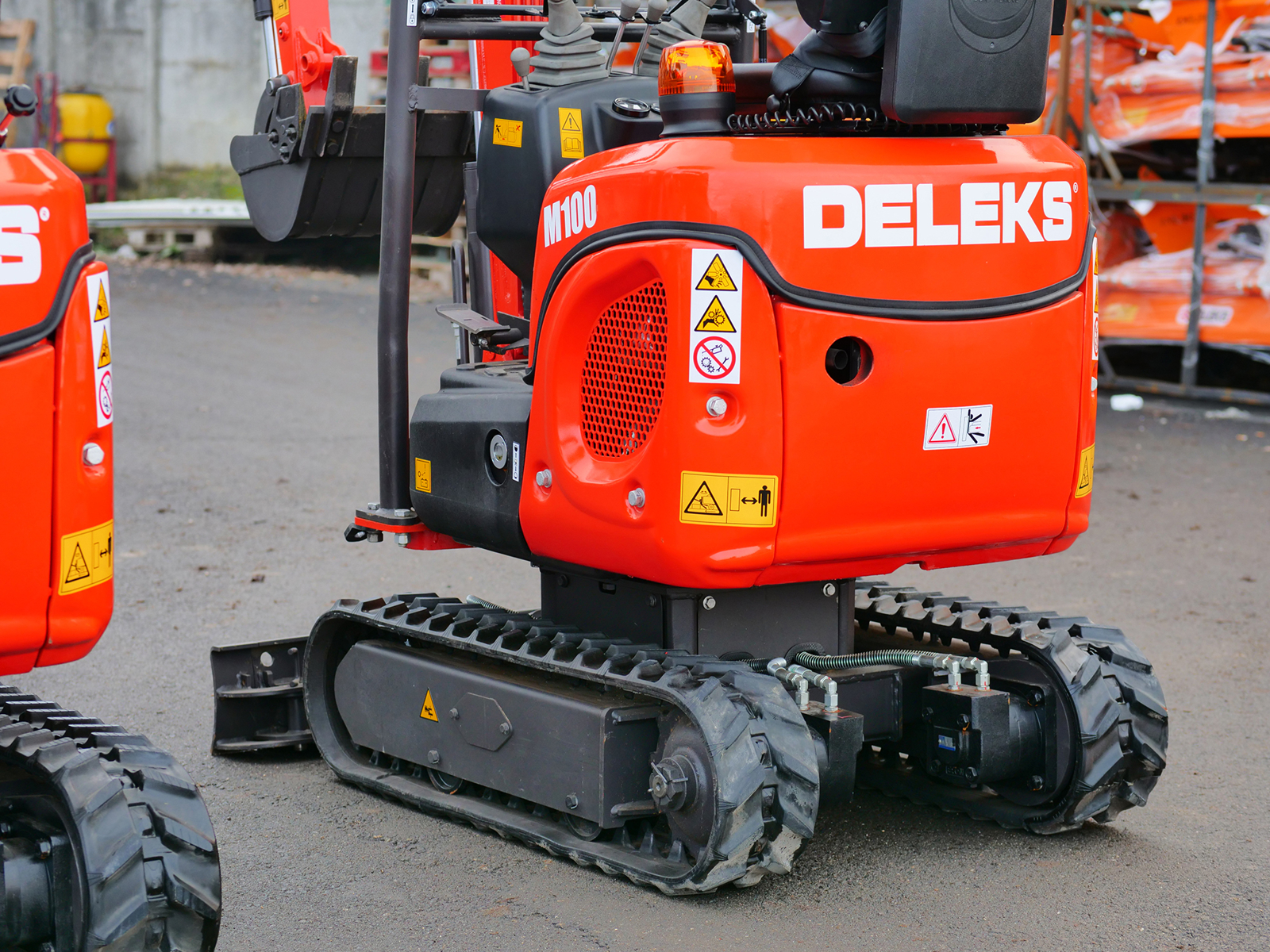 The DELEKS® M100 compact mini excavator (1 ton) is equipped with a Kubota D722 three-cylinder diesel engine, extendable undercarriage, and swing boom.