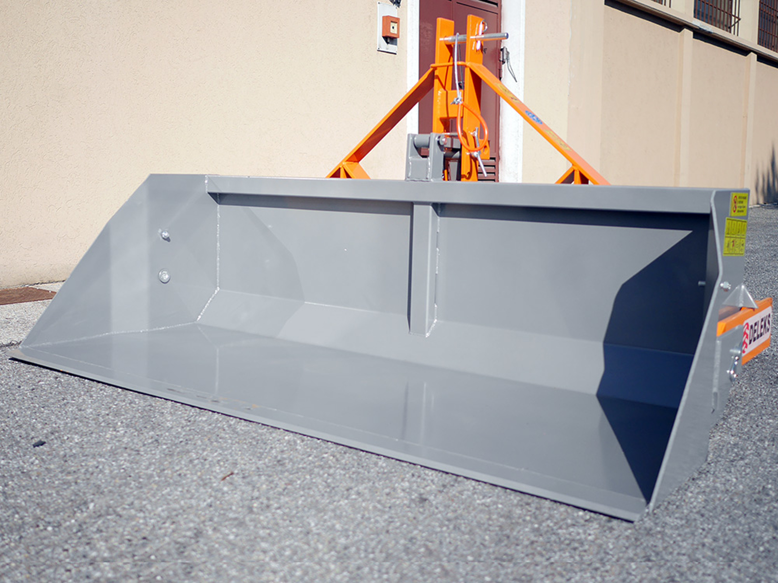 Mechanische Heckschaufel, rundum verstärkt,  zum Laden und Transport verschiedenster Materialien wie Kies, Torf oder Holz, sowie für Räumarbeiten bei Schnee und Einebnung von Böden verschiedenster Beschaffenheiten. Geeignet für Traktoren und Schlepper mit Reifen oder Gleisketten von 50 – 90 PS wie z.Bsp. New Holland TK4000, T3030, T4F, John Deere Serie 4 – 5, Carraro Tigrone, SAME Solaris, Kubota M, Fendt, uvm. Universal 3-Punktaufnahme Kategorie 1 – 2. CE Zertifizierung, 2 Jahre Garantie.