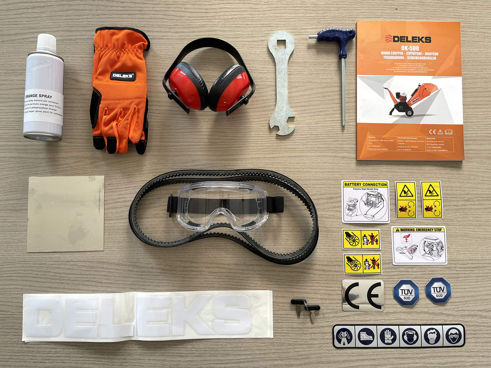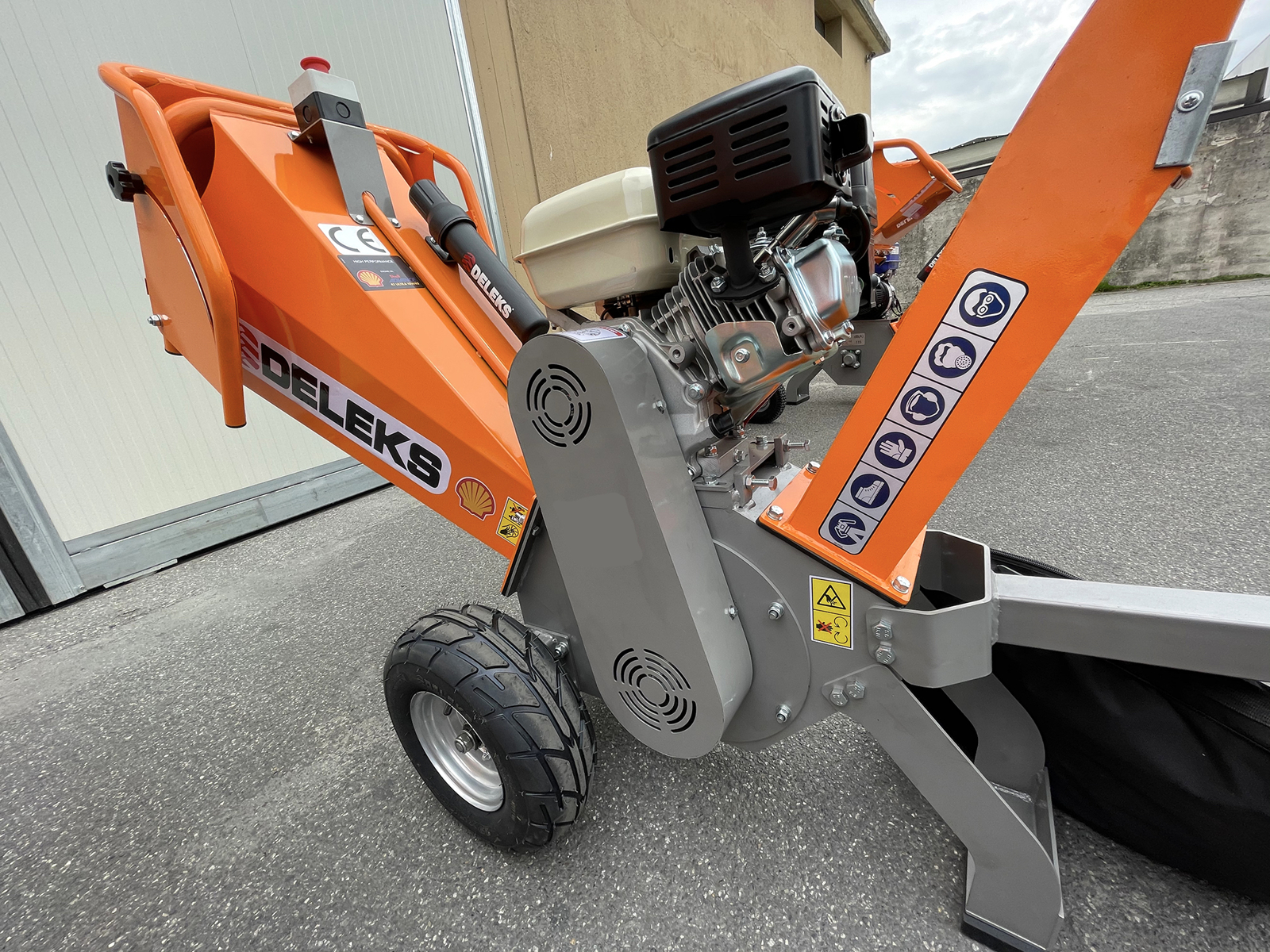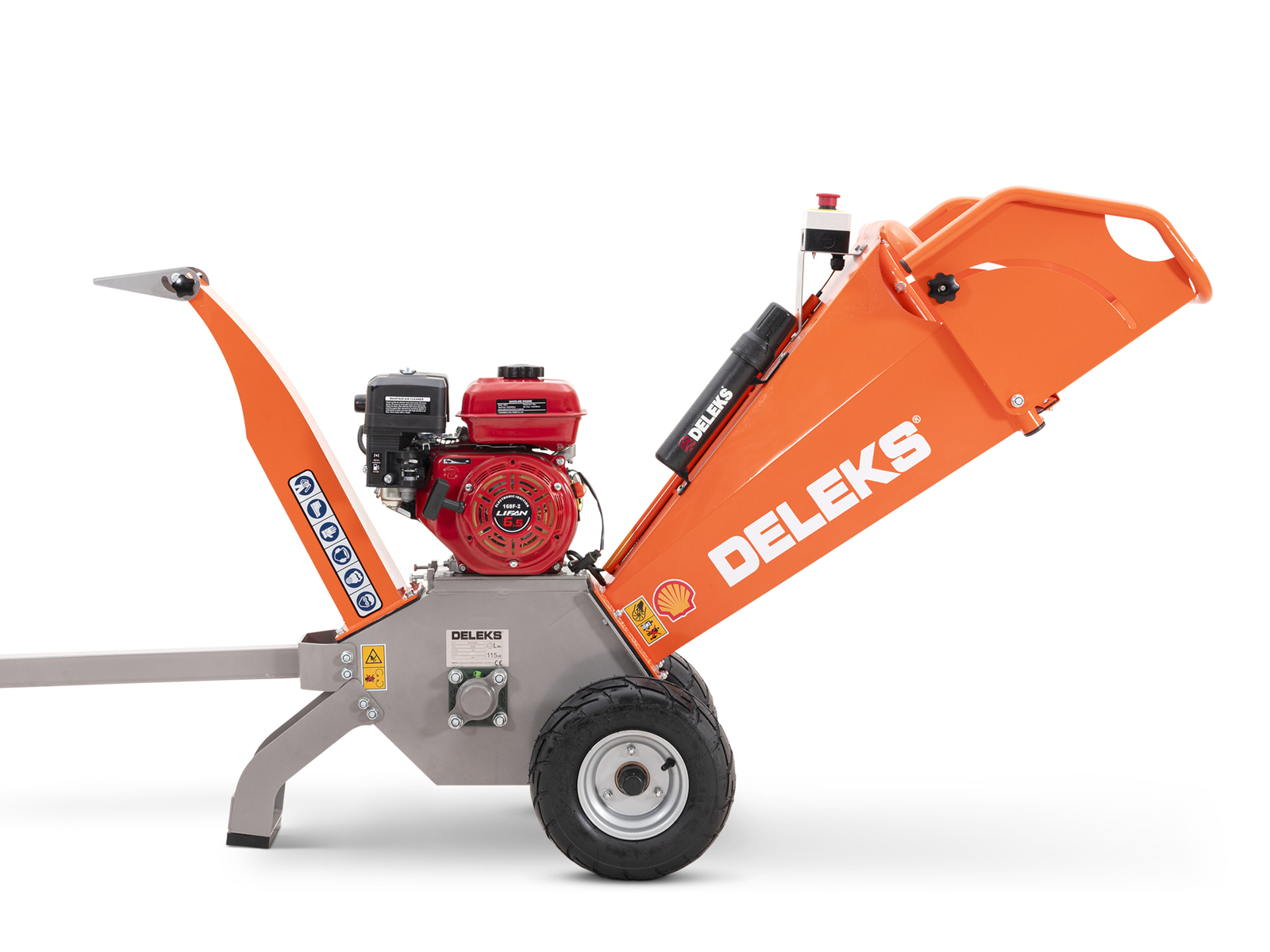 Professionele DELEKS houtversnipperaar met onafhankelijke 6,5 PK 4-takt benzinemotor. 2 omkeerbare messen van speciaal staal.