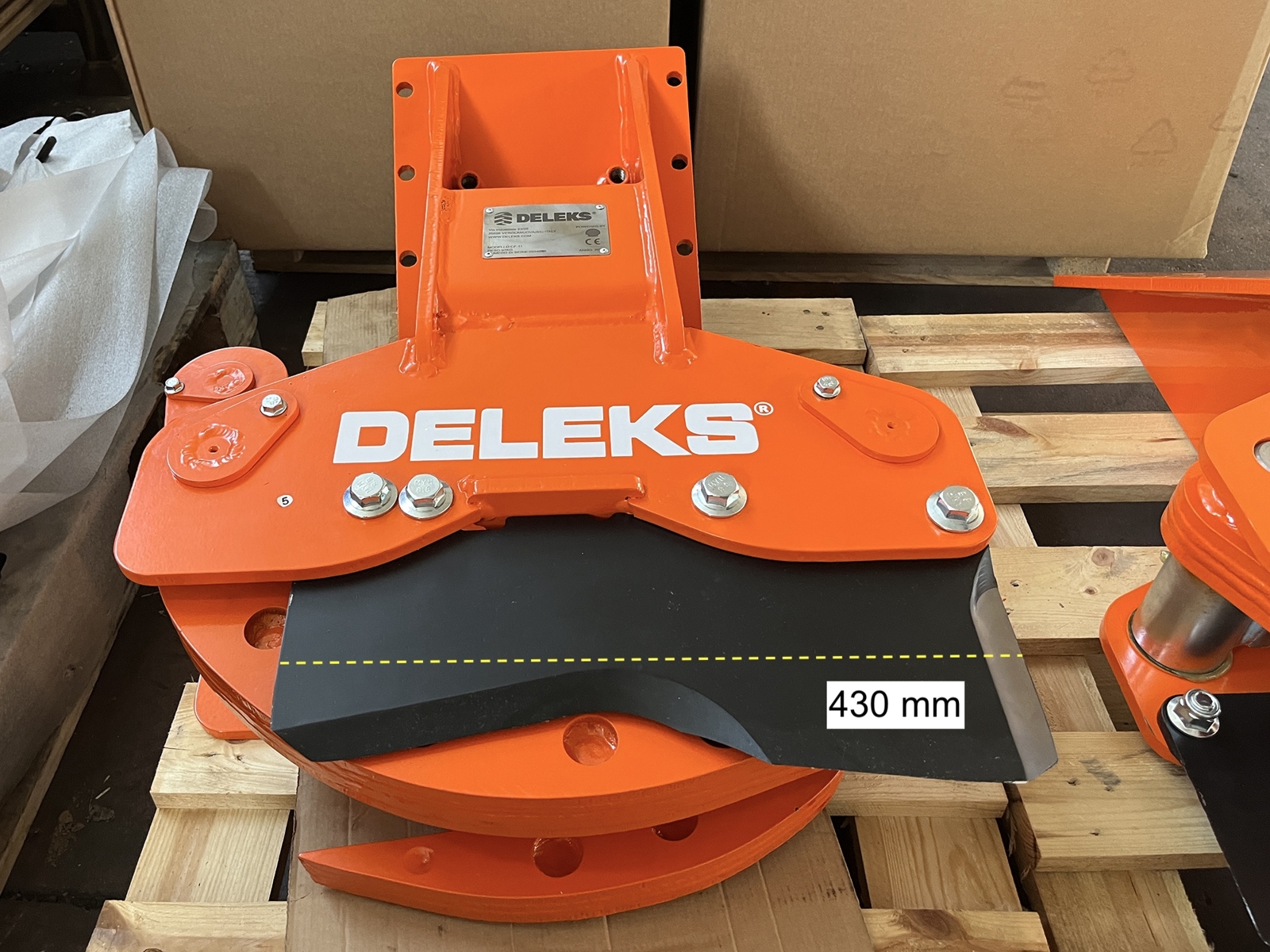 De hydraulische snoeischaar van de DELEKS® CF-11 minigraafmachine kan worden gebruikt om bomen te vellen of om dunner hout samen met de grijper te bundelen voor het knippen. De schaar heeft een sterk gehard blad dat schoon en veilig door het hout snijdt.