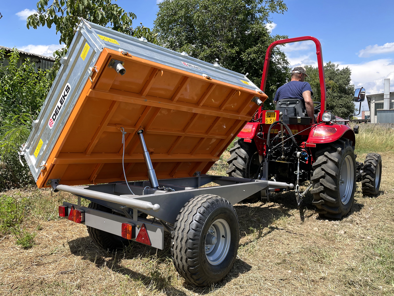 DELEKS® aanhangwagen met één as - twee wielen - voor compacte tractoren met 20-70pk zoals Valpadana, Renault, Massey Ferguson, New Holland Boomer, New Holland Boomer. Valpadana, Renault, Massey Ferguson, New Holland Boomer, Antonio Carraro Tigre, John Deere 2 series.
